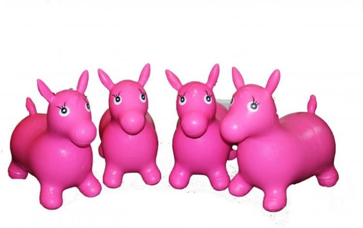 These bright pink ride / bounce on inflatable animals hoppers are so much fun!