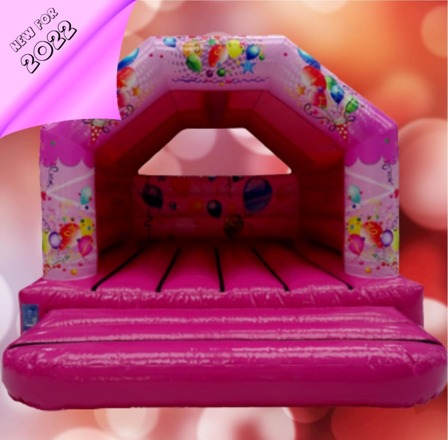 Check out our cool new pink party themed 12 x 16ft castle. Celebrate your up coming event in style with this brightly coloured party castle! Bounce around in a sea of bright colours and an ensemble of dancing balloons to make your day as fun as possible!