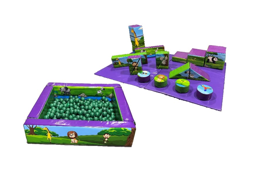 Our 18 piece JUNGLE theme soft play with 2 mats AND matching 5ft x 5ft ball pool