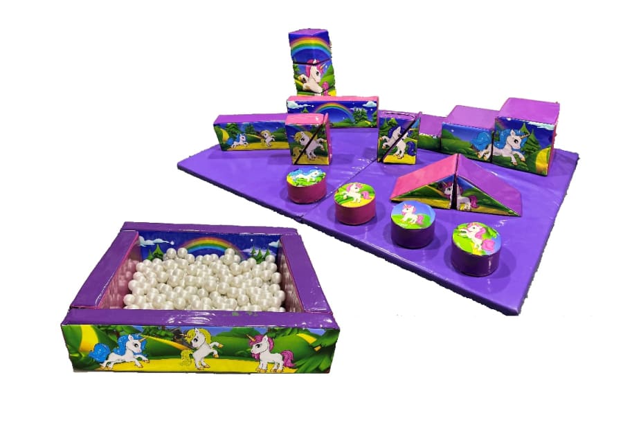 Our 18 piece Unicorn theme soft play with 2 mats AND matching 5ft x 5ft ball pool